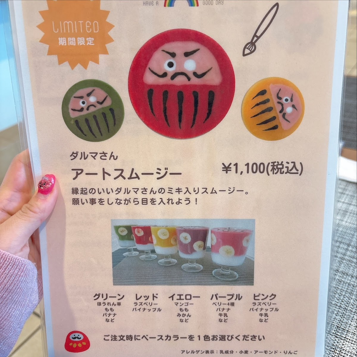- Unique Offerings: Highlighted on the menu is the whimsical "Daruma-san Art Smoothie," where guests add their personal touch by inserting eyes into a daruma doll—a blend of tradition and tropical flavors!